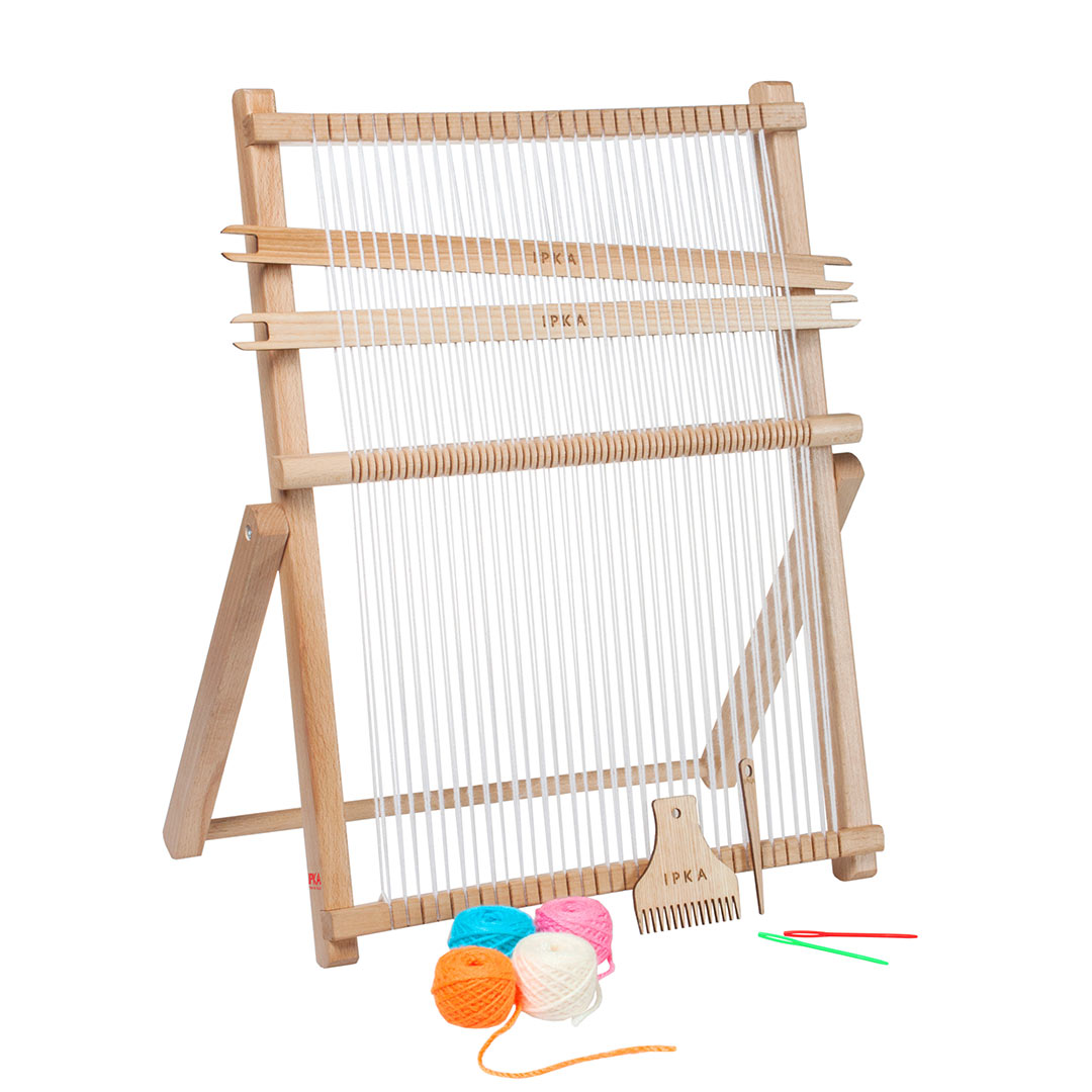 دار بافندگی بزرگ پایه دار ایپکا، ابزاری کاربردی است که از چوب طبیعی و با کیفیت و با هدف آموزش مهارت بافندگی برای سنین 6 سال به بالا طراحی و تولید شده است. شما می توانید با استفاده از روش های بافت موجود در دفترچه راهنما و انواع کاموا در رنگ های مختلف، بی نهایت طرح زیبا و خلاقانه ببافید، آن ها را با گلدوزی، پولک و منجوق و … بیارایید و از آن ها برای درست کردن کوسن، کیف، جامدادی، زیورآلات و یا به صورت آویز برای تزیین دیوار اتاق استفاده کنید. همچنین با اتصال دستبافه های کوچک به یکدیگر، دستبافه های بزرگ تری مانند شال، فرش و … خلق نمایید. بافندگی با دار، باعث افزایش تمرکز و هماهنگی بین چشم و دست شده و به تقویت مهارت حرکتی و پرورش خلاقیت و اعتماد به نفس کمک شایانی می کند.